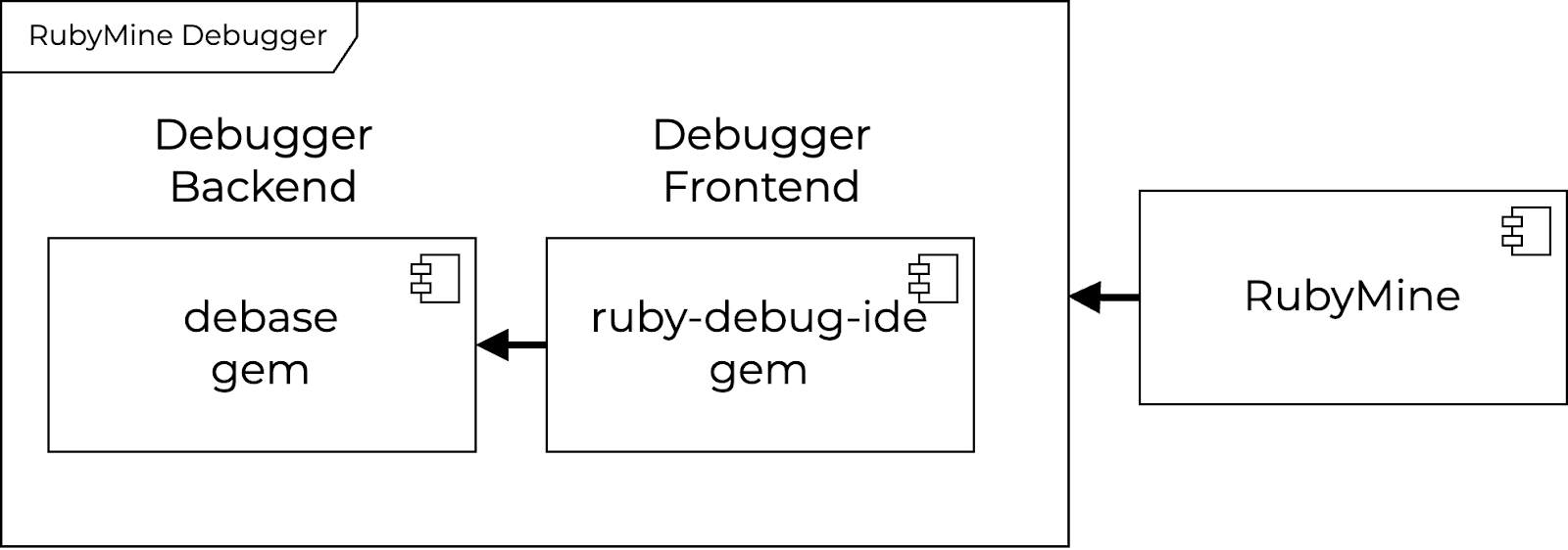 The second part is the ruby-debug-ide gem, which serves as the internal debugger frontend. This critical piece manages the communication between RubyMine and the backend by establishing and maintaining their connection. It handles the message protocol and processes commands coming from RubyMine. Additionally, it’s responsible for creating readable text representations of Ruby objects that developers will see in the RubyMine debugger Tool Window.
