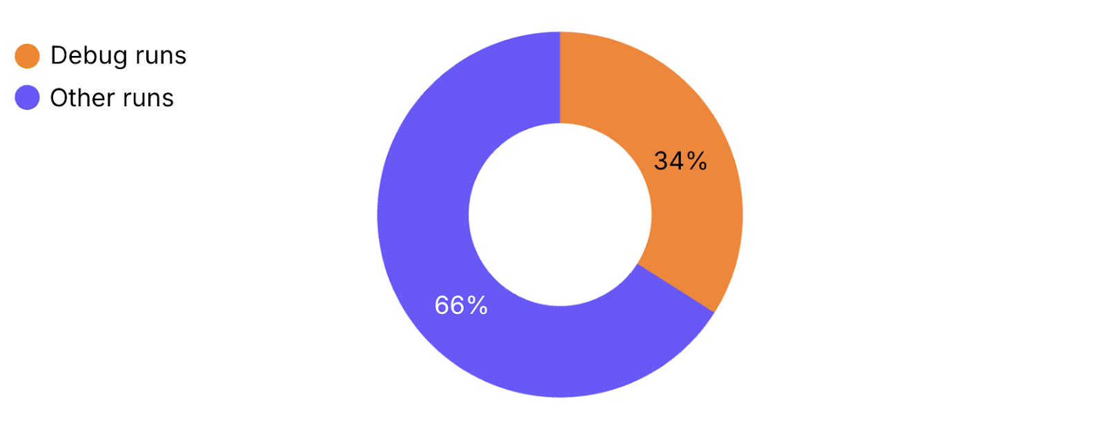 The pie chart below shows how often RubyMine users run their code using a debugger compared to other types of run configurations. These numbers come from anonymous usage stats collected in RubyMine 2025.1.