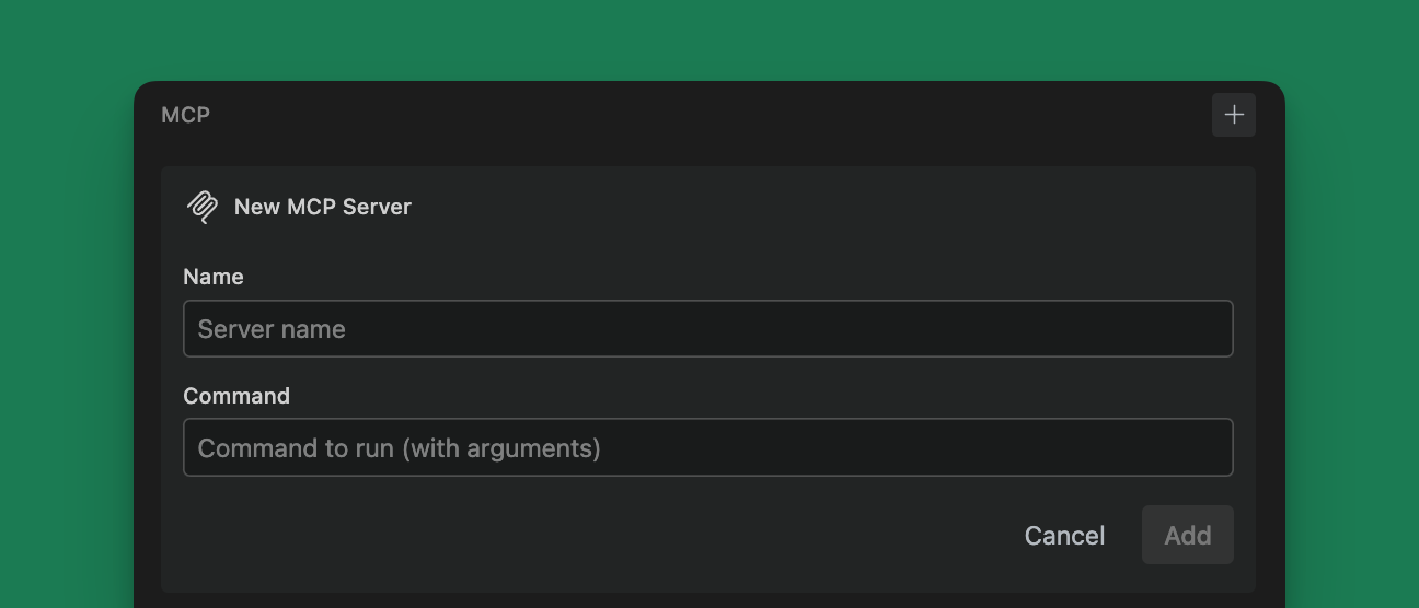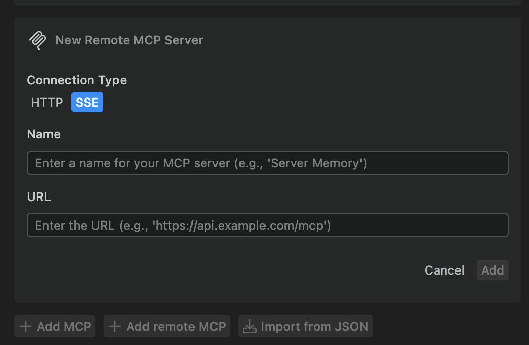 If your MCP server runs remotely (for example, a hosted service), click the ”+ Add remote MCP” button in the MCP section. Remote MCP connections support both HTTP and SSE (Server‑Sent Events).