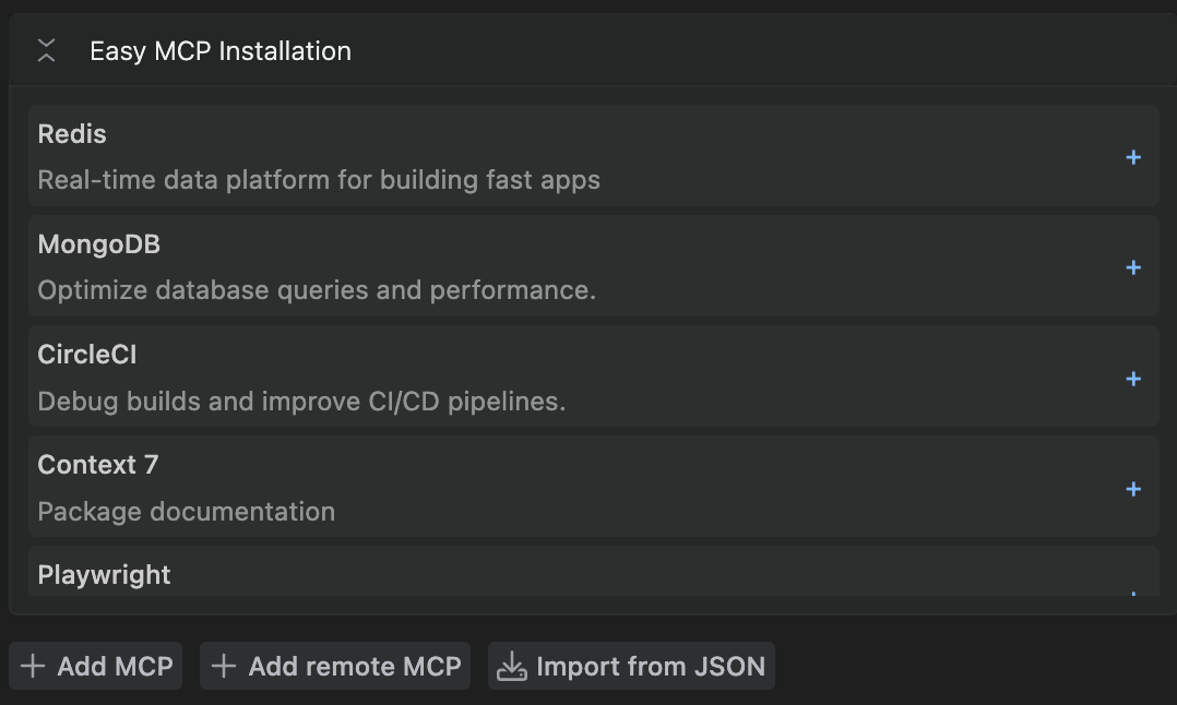 New: Easy MCP launched on July 30, 2025, making it easier than ever to connect popular developer tools to Augment Code.Easy MCP is a new feature in the Augment Code extension that transforms complex MCP server setup into a single click. Instead of manually configuring servers, hunting for GitHub repos, or editing JSON files, you can now connect popular developer tools with just an API token or OAuth approval.