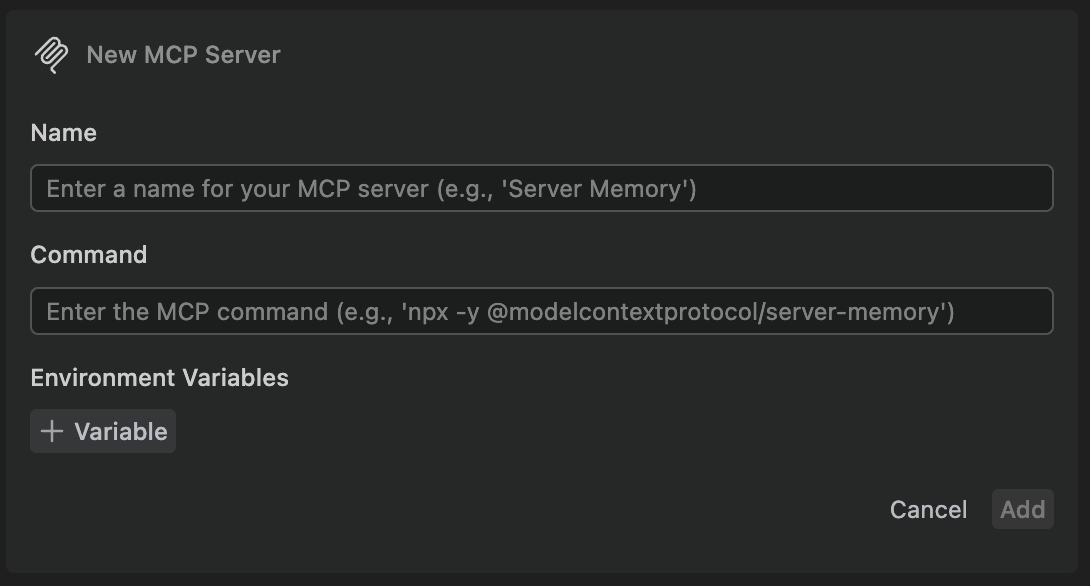 name and command fields. The name field must be a unique name for the server. The command field is the command to run the server. Environment variables have their own section and no longer need to be specified in the command.