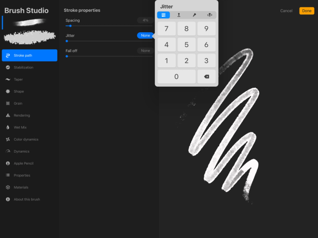 Every slider in Brush Studio can also be adjusted numerically for greater control. Tap the numerical value of a slider to open the advanced brush settings and type in the precise number you need, or Scribble in your values using Apple Pencil. See more about Advanced Brush Settings below.