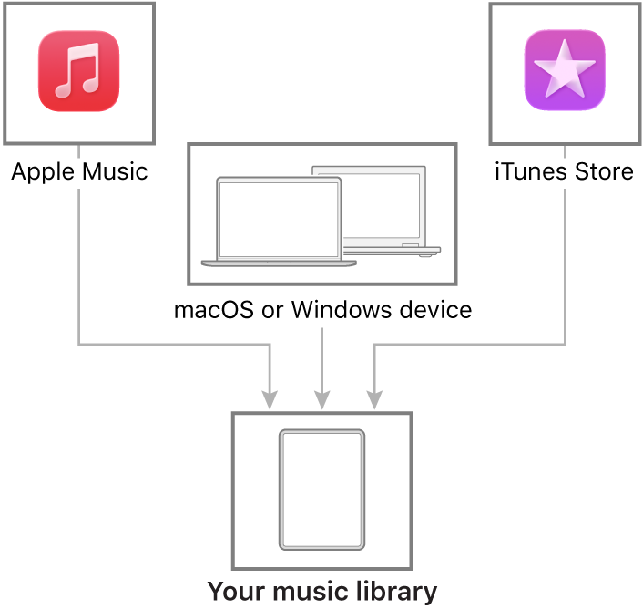 Connect your Mac or Windows device to transfer and update music between your iPad and your device. To sync supported content, use Music (macOS 10.15 or later) or iTunes (macOS 10.14 or earlier and Windows devices).