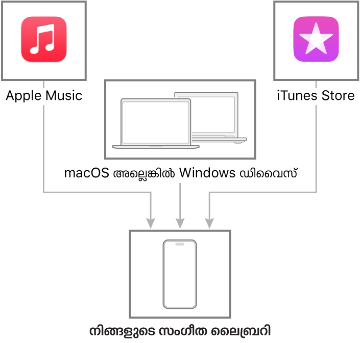 നിങ്ങളുടെ iPhone-നും ഡിവൈസിനും ഇടയിൽ സംഗീതം കൈമാറ്റം ചെയ്യാനും അപ്ഡേറ്റ് ചെയ്യാനും നിങ്ങളുടെ Mac അല്ലെങ്കിൽ Windows ഡിവൈസ് കണക്റ്റ് ചെയ്യൂ. പിന്തുണയ്ക്കുന്ന ഉള്ളടക്കം സിങ്ക് ചെയ്യാൻ, സംഗീതം ( macOS 10.15 അല്ലെങ്കിൽ അതിനുശേഷമുള്ളത്) അല്ലെങ്കിൽ iTunes ( macOS 10.14 അല്ലെങ്കിൽ അതിനുമുൻപുള്ളതും Windows ഡിവൈസുകളും) ഉപയോഗിക്കൂ.