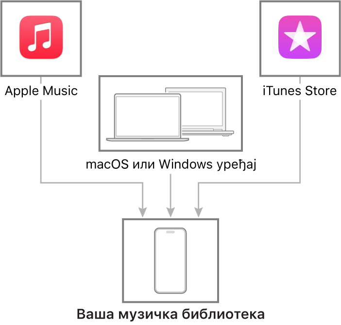 Повежите Mac или Windows уређај да бисте могли на њега да пренесете и ажурирате музику са iPhone-а, или обратно. Да бисте синхронизовали подржани садржај, користите Music (macOS 10.15 или новија верзија) или iTunes (macOS 10.14 или новија верзија и Windows уређаји).