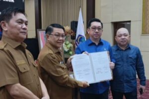 Manado – Ketua Dewan Pimpinan Daerah (DPD) Partai Demokrat Sulawesi Utara (Sulut) Mor Dominus Bastiaan didampingi Bendahara Roger Mamesah menghadiri penandatanganan berita acara penyaluran
