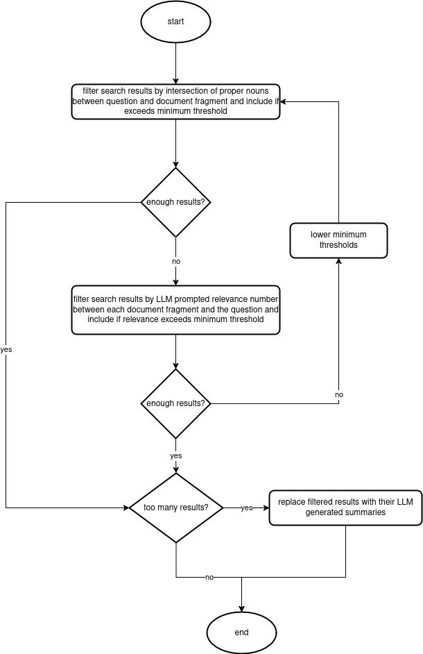 You must figure out a way to rerank the search results based on relevance and include only the most relevant results in the prompt. Perhaps you can find some domain-specific heuristics for estimating relevance. For our purposes, results that included enough proper nouns from the question (see POS tagging above) were considered to be relevant. If you are in a contentious and polarizing domain, you should also include sentiment analysis with proper nouns, although this was not necessary for our project. If we didn’t get enough relevant results this way, we would try the worst-case solution which is to loop through all the search results and then prompt the LLM to calculate the relevance of each result. The system instructions could appear as follows: