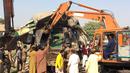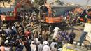 Alat berat digunakan untuk mencari korban kecelakaan kereta di di Karachi, Pakistan, Kamis (3/11). Akibat kecelakaan itu Tiga gerbong Farid Express rusak parah sedangkan dua gerbong lainnya rusak sebagian. (Reuters/Akhtar Soomro)