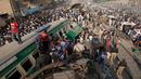 Warga dan relawan mencari korban yang masih berada didalam bangkai kereta setelah terjadi kecelakaan di Karachi, Pakistan, Kamis (3/11). (AP Photo/Shakil Adil)