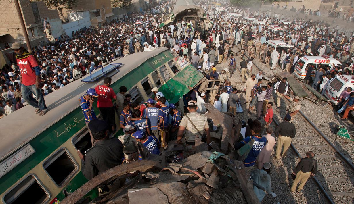 Para warga dan relawan mengangkat tubuh korban yang terluka akibat kecelakaan kereta di Karachi, Pakistan, Kamis (3/11). Menurut petugas, sinyal gagal mengalihkan kereta Zakria Express ke rel lain hingga akhirnya terjadi kecelakaan. (AP Photo/Shakil Adil)