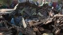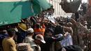 Petugas dan relawan mengevakuasi jasad korban kecelakaan dari puing-puing kereta di Karachi, Pakistan, Kamis (3/11). Kecelakaan itu terjadi akibat kereta penumpang Farid Express bertabrakan dengan kereta penumpang Zakria Express. (AP Photo/Shakil Adil)