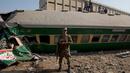 Petugas keamanan Pakistan berdiri berjaga di depan bangkai kereta setelah terjadi kecelakaan di Karachi, Pakistan, Kamis (3/11). (AP Photo/Shakil Adil)