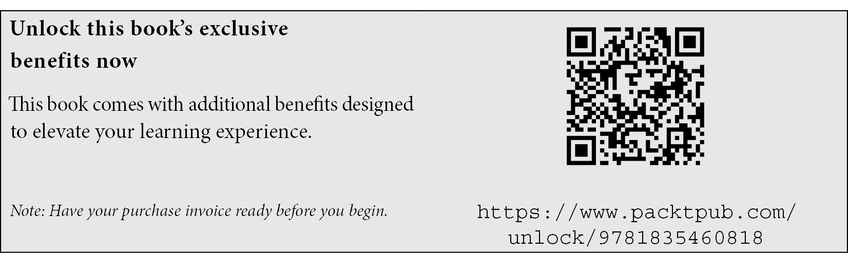 Chapter 19: Unlock Your Book’s Exclusive Benefits Chevron down icon Chevron up icon