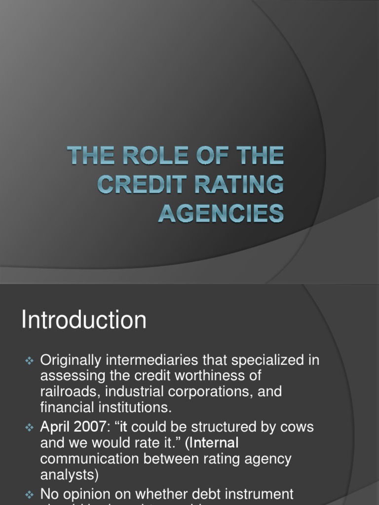 Originally intermediaries that specialized in assessing the credit worthiness of railroads, industrial corporations, and financial institutions. April 2007: it could be structured by cows and we would rate it. (Internal communication between rating agency analysts) No opinion on whether debt instrument should be bought or sold