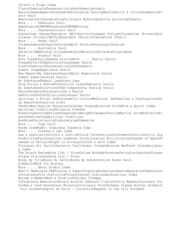 . . . Chemicals Vault AmphetamineDXMGHBKetamineLSDMDMANitrous More . . . Pharmaceuticals Vault Alprazolam (Xanax)Bupropion (Wellbutrin)Diazepam (Valium)Fluoxetine (Prozac)Hydr ocodone (Vicodin)Methylphenidate (Ritalin)Paroxetine (Paxil) More . . . Herbs Vault CalamusDamianaFoxgloveGinsengMilk ThistlePennyroyalValerian More . . . Nootropics Vault AdrafinilDMAEGinkgo bilobaHydergineMelatoninPiracetamTryptophan More . . . Animals Vault Bufo ToadsPhyllomedusa bicolorMore . . . Basics Vaults DosageEffectsFAQsHistorySlangImage Vaults PlantsChemicalsPharmaceuticalsHerbsSmarts Submit ImageExperience Vaults New ReportsBy SubstanceSearchAbout Experience Vaults Submit ExperienceLaw Vaults By SubstanceFederal LawsState Laws Drug Policy & ReformProhibition LinksChemistry Vaults By SubstanceStructuresChem-CompareDrug Testing Vaults BasicsProductsPsychoactives & Health AddictionLD50sStatisticsEntheogen Vaults Spiritual & Ritual UsePsychedelic CultureMedicinal UseFamilies & PsychoactivesDr ug HumorPsychoactive Links VendorsNon-English ResourcesCalendar EventsArchived SitesMind & Spirit Index Spiritual TraditionsReligious Freedom BreathingDancingDevicesDreamingDrummingEntheogensFastingMartial ArtsMeditationPr ayerSweatingYogaSpiritual Traditions BuddhismChristianityHinduismIslamShamanism More . . . Yoga Vault Karma YogaBhakti YogaJnana YogaRaja Yoga More . . . Freedom & Law Index Law & LegislativeCourts & JusticePolice InteractionsGovernmentElectionsCivil Rig htsActivismPsychoactives LawAsset ForfeitureJury NullificationFreedom of SpeechF reedom of ReligionRight to PrivacyCulture & Arts Index Visionary Art VaultsCharacter VaultsGuest ColumnsBurning ManEvent CalendarLibrar y Index The Erowid ReviewBook List / StoreOnline BooksReferencesPeriodicalsQuotesGlossar ySlang DictionaryBook List / Store Books By TitleBooks By AuthorBooks By SubjectOnline Books Vault PiHKALTiHKALE for Ecstasy More . . . About Erowid Index What's NewErowid FAQFunding & SupportCopyrightsAnnouncementsNewsletterSubmission sVolunteersSite StatisticsPrivacyContent DisclaimerDonations Index Become a MemberMake a DonationPeriodic Pledges GiftsErowid NewsletterErowid Archive CDErowid T-shirtPoetry MagnetsVisionary Pos terNew & Used BooksGlass MoleculesVisionary PrintHofmann Signed Blotter ArtAbout this DocumentReport an Error / CorrectionRequest to Use this Document