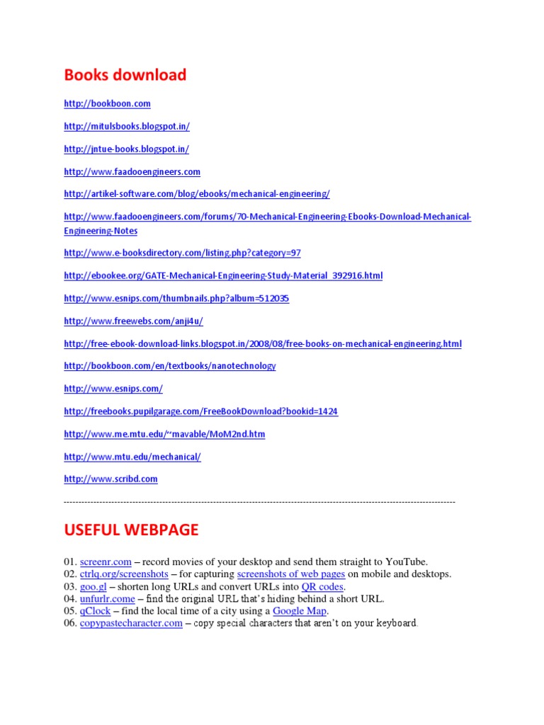 http://bookboon.com http://mitulsbooks.blogspot.in/ http://jntue-books.blogspot.in/ http://www.faadooengineers.com http://artikel-software.com/blog/ebooks/mechanical-engineering/ http://www.faadooengineers.com/forums/70-Mechanical-Engineering-Ebooks-Download-MechanicalEngineering-Notes http://www.e-booksdirectory.com/listing.php?category=97 http://ebookee.org/GATE-Mechanical-Engineering-Study-Material_392916.html http://www.esnips.com/thumbnails.php?album=512035 http://www.freewebs.com/anji4u/ http://free-ebook-download-links.blogspot.in/2008/08/free-books-on-mechanical-engineering.html http://bookboon.com/en/textbooks/nanotechnology http://www.esnips.com/ http://freebooks.pupilgarage.com/FreeBookDownload?bookid=1424 http://www.me.mtu.edu/~mavable/MoM2nd.htm http://www.mtu.edu/mechanical/ http://www.scribd.com -----------------------------------------------------------------------------------------------------------------------------------