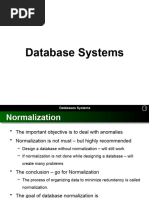 UNIT 1 In Emp_Dept, if we change the value of one of the attribute of a particular departmentsay, the manager of department 5-we must update the tuples of all employees who work in that department; other wise, the database will become inconsistent. If we fail to update some tuples, the same department will be shown to have 2 different values for manager in different employee tuple which would be wrong. All three kinds of anomalies are highly undesirable, since their occurrence constitutes corruption of the database. Properly normalized databases are much less susceptible to corruption than are unnormalized databases. Normalization Designing a normalized database structure is the first step when building a database that is meant to last. Normalization is a simple, commonsense, process that leads to flexible, efficient, maintainable database structures. We'll examine the major principles and objectives of normalization and denormalization, and then take a look at some powerful optimization techniques that can break the rules of normalization. What is Normalization? Yes, but what is this normalization all about? If I am simply putting it, normalization is a formal process for determining which fields belong in which tables in a relational database. Normalization follows a set of rules worked out at the time relational databases were born. A normalized relational database provides several benefits: Elimination of redundant data storage. Close modeling of real world entities, processes, and their relationships. Structuring of data so that the model is flexible. Normalization ensures that you get the benefits relational databases offer. Time spent learning about normalization will begin paying for itself immediately. Why do they talk like that? Some people are intimidated by the language of normalization. Here is a quote from a classic text on relational database design: 5