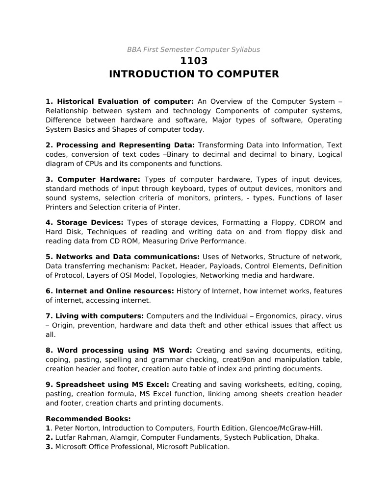 1. Historical Evaluation of computer: An Overview of the Computer System Relationship between system and technology Components of computer systems, Difference between hardware and software, Major types of software, Operating System Basics and Shapes of computer today. 2. Processing and Representing Data: Transforming Data into Information, Text codes, conversion of text codes Binary to decimal and decimal to binary, Logical diagram of CPUs and its components and functions. 3. Computer Hardware: Types of computer hardware, Types of input devices, standard methods of input through keyboard, types of output devices, monitors and sound systems, selection criteria of monitors, printers, - types, Functions of laser Printers and Selection criteria of Pinter. 4. Storage Devices: Types of storage devices, Formatting a Floppy, CDROM and Hard Disk, Techniques of reading and writing data on and from floppy disk and reading data from CD ROM, Measuring Drive Performance. 5. Networks and Data communications: Uses of Networks, Structure of network, Data transferring mechanism: Packet, Header, Payloads, Control Elements, Definition of Protocol, Layers of OSI Model, Topologies, Networking media and hardware. 6. Internet and Online resources: History of Internet, how internet works, features of internet, accessing internet. 7. Living with computers: Computers and the Individual Ergonomics, piracy, virus Origin, prevention, hardware and data theft and other ethical issues that affect us all. 8. Word processing using MS Word: Creating and saving documents, editing, coping, pasting, spelling and grammar checking, creati9on and manipulation table, creation header and footer, creation auto table of index and printing documents. 9. Spreadsheet using MS Excel: Creating and saving worksheets, editing, coping, pasting, creation formula, MS Excel function, linking among sheets creation header and footer, creation charts and printing documents. Recommended Books: 1. Peter Norton, Introduction to Computers, Fourth Edition, Glencoe/McGraw-Hill. 2. Lutfar Rahman, Alamgir, Computer Fundaments, Systech Publication, Dhaka. 3. Microsoft Office Professional, Microsoft Publication.