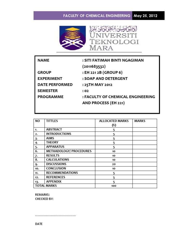 : SITI FATIMAH BINTI NGAGIMAN (2011683532) : EH 221 2B (GROUP 6) : SOAP AND DETERGENT : 25TH MAY 2012 : 02 : FACULTY OF CHEMICAL ENGINEERING AND PROCESS (EH 221)
