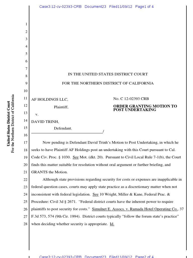 Now pending is Defendant David Trinhs Motion to Post Undertaking, in which he seeks to have Plaintiff AF Holdings post an undertaking with this Court pursuant to Cal. Code Civ. Proc. 1030. See Mot. (dkt. 20). Pursuant to Civil Local Rule 7-1(b), the Court finds this matter suitable for resolution without oral argument or further briefing, and GRANTS the Motion. Although state provisions regarding security for costs or expenses are inapplicable in federal question cases, courts may apply state practice as a discretionary matter when not inconsistent with federal legislation. See 10 Wright, Miller & Kane, Federal Prac. & Procedure: Civil 3d 2671. Federal district courts have the inherent power to require plaintiffs to post security for costs. Simulnet E. Assocs. v. Ramada Hotel Operating Co., 37 F.3d 573, 574 (9th Cir. 1994). District courts typically follow the forum states practice when deciding whether security is appropriate. Id.