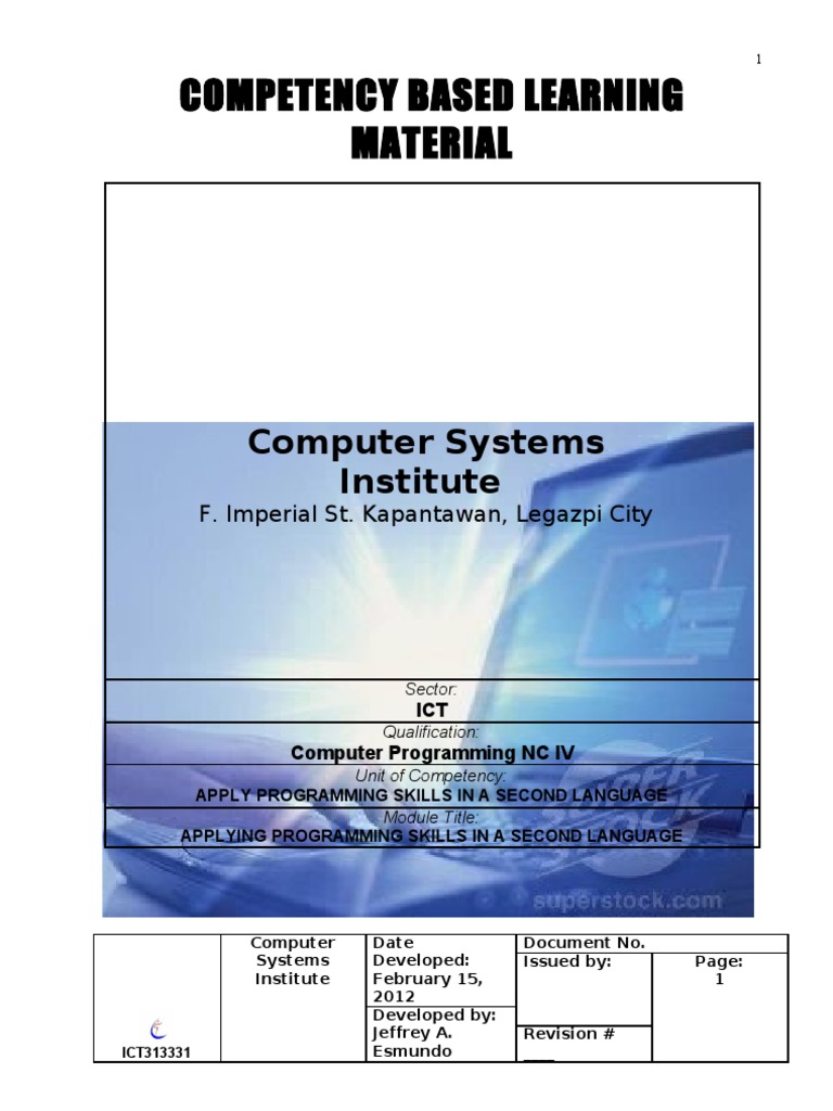 How to use this Competency-Based Learning Material Welcome to the APPLY PROGRAMMING SKILLS IN A SECOND LANGUAGE. This module contains training materials and activities for you to complete. The unit of competency "APPLY PROGRAMMING SKILLS IN A SECOND LANGUAGE" contains the knowledge, skills and attitudes required for a Computer Programming. It is one of the core competencies at National Certificate IV (NC IV) level. You are required to go through a series of learning activities in order to complete each learning outcomes of the module. In each learning outcome there are Information Sheets and Resource Sheets (Reference Materials for further reading to help you better understand the required activities. Follow these activities on your own and answer the self-check at the end of each learning outcome. You may remove a blank answer sheet at the end of each module (or get one from your facilitator/trainer) to write your answers for each self-check. If you have questions, dont hesitate to ask your facilitator for assistance. Recognition of Prior Learning (RPL) You may already have some or most of the knowledge and skills covered in this learner's guide because you have: been working for some time already completed training in this area.
