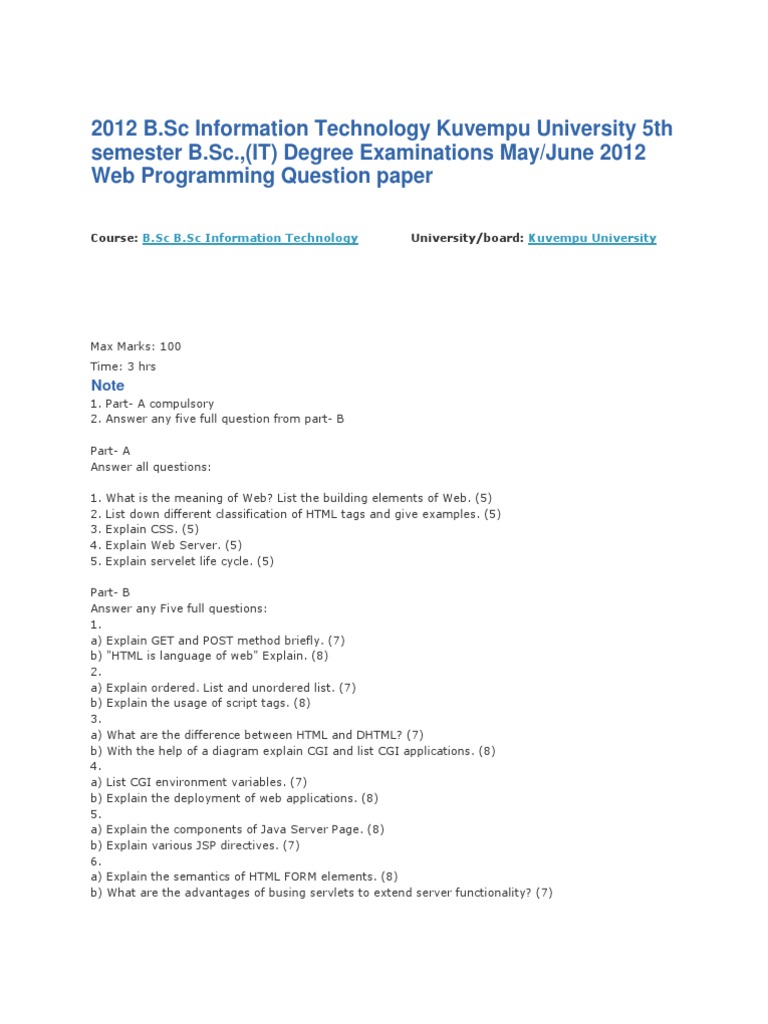 Part- B Answer any Five full questions: 1. a) Explain GET and POST method briefly. (7) b) "HTML is language of web" Explain. (8) 2. a) Explain ordered. List and unordered list. (7) b) Explain the usage of script tags. (8) 3. a) What are the difference between HTML and DHTML? (7) b) With the help of a diagram explain CGI and list CGI applications. (8) 4. a) List CGI environment variables. (7) b) Explain the deployment of web applications. (8) 5. a) Explain the components of Java Server Page. (8) b) Explain various JSP directives. (7) 6. a) Explain the semantics of HTML FORM elements. (8) b) What are the advantages of busing servlets to extend server functionality? (7)