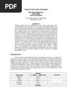 In this experiment, alkaline copper sulphate reacts with compounds containing two or more peptide bonds to give the violet-colored complex. The depth of the color obtained is a measure of the number of peptide bonds present in the protein. The reaction is not absolutely specific for peptide bonds, since the compounds containing two carbonyl groups linked through hydrogen or carbon atom will give a positive result. Xanthroproteic: Xanthoproteic comes from the Greek word xanthos which means yellow. Boiling concentrated nitric acid reacts with tyrosine, tryptophan and phenylalanine (phenylalanine give weakly positive reaction as it contain an inactive benzene ring) to yield yellow products. The intensity of yellow color deepens upon the addition of alkaline solution that form orange colored salt in the basic medium.
