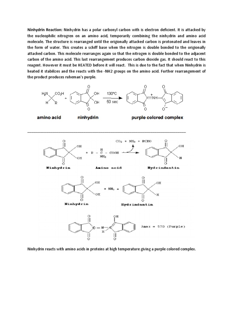 It is attacked by the nucleophilic nitrogren on an amino acid, temporarily combining the ninhydrin and amino acid molecule. The structure is rearranged until the origionally attacked carbon is protonated and leaves in the form of water. This creates a schiff base when the nitrogen is double bonded to the origionally attacked carbon. This molecule rearranges again so that the nitrogen is double bonded to the adjacent carbon of the amino acid. This last rearrangement produces carbon dioxide gas. It should react to this reagent. However it must be HEATED before it will react. This is due to the fact that when Ninhydrin is heated it stabilizes and the reacts with the -NH2 groups on the amino acid. Further rearrangement of the product produces ruheman's purple.