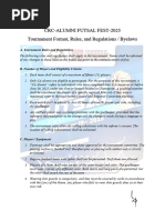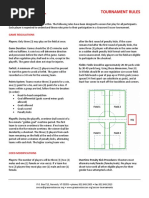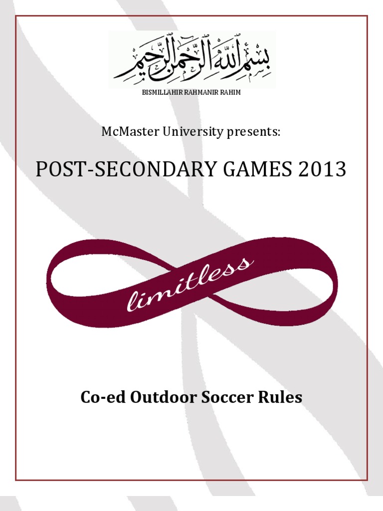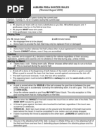 Specific Rules for Outdoor Soccer LIMITLESS 2013 A) Teams & Players 1. A Maximum of 15 players per squad is permitted 2. Each University can have up to 2 teams, on a special exception bases will there be a 3rd team 3. Teams shall consist of 7 players (including a goalie) but must have a minimum of 5 players to start a game 4. Each team must have no less than 5 players (minimum of 1 female) at game time 5. Any team without the required number of players within 5 minutes of the scheduled time will default the game 6. There must be 1 female on the field at all times, for each team, otherwise the game will be defaulted B) Equipment 1. No jewellery (unless properly taped down), non-elastic headbands, or hard support braces are allowed during game time. Captains will be warned at the beginning of the game to have all their players remove such items. During the game, players found with such items will be asked to leave the game until the item is removed 2. A game ball will be provided for game play only (not for practicing). 3. All players must wear proper equipment and must be in contrasting colour to the opposing team 4. Proper gym attire must be worn to participate (no jeans or pants/ shorts with zippers). Proper athletic footwear for the sport is required (i.e. running shoes or cleats that are NOT metal cleats) 5. Shin guards are mandatory 6. All games will be played on half of an outdoor soccer field. C) Game lengths 1. All round robin games will consist of two 20-minute halves, running time. There will be a 3minute halftime in between halves 2. Playoffs will consist of two 20-minute running time halves with a 5-minute halftime 3. Final games will consist of two running time 25-minute halves with a 5-minute halftime 4. Tie Breaker Procedure: a. If tied after full-time, penalty shoot our will take place b. First do coin toss to see who will shoot first c. Select 5 players from each team to shoot d. If tied after 5 shooters, sudden death shootout will be carried on (teams must cycle through the entire team on the field before an individual can shoot again) 5. Goaltenders must remain constant throughout. At the discretion of the team they may be used as a shooter 6. All the substitutes must remain outside the field and the rest of the players not participating must remain in the centre circle 7. Nets will be used to the referees discretion D) Point System 1. A win gets 3 points in the divisional standings 2. A tie gets 1 point in the divisional standings