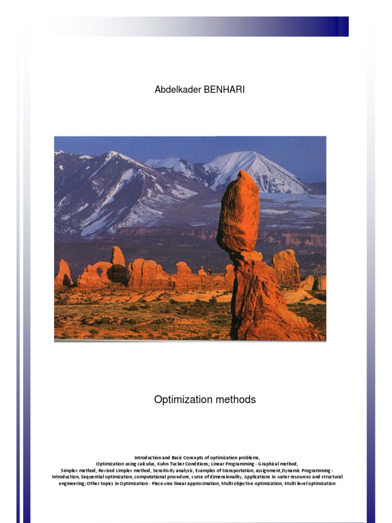 Introduction and Basic Concepts Historical Development and Model Building Optimization Problem and Model Formulation Classification of Optimization Problems Classical and Advanced Techniques for Optimization Optimization using Calculus-Stationary Points Stationary points: Functions of Single and Two Variables Convexity and Concavity of Functions of One and Two Variables Optimization using Calculus - Unconstrained Optimization Optimization of Functions of Multiple Variables: Unconstrained Optimization Optimization using Calculus Kuhn-Tucker Conditions Linear Programming- Preliminaries Linear Programming- Graphical Method Linear Programming- Simplex Method-I Linear Programming- Simplex Method II Revised Simplex Method, Duality and Sensitivity analysis Linear Programming - Other Algorithms for Solving Linear Programming Problems Linear Programming Applications Software MATLAB Toolbox for Linear Programming Linear Programming Applications Transportation Problem Transportation Problem Linear Programming -Assignment Problem Linear Programming Applications Structural & Water Resources Problems Dynamic Programming Introduction Dynamic Programming Recursive Equations Computational Procedure in Dynamic Programming Dynamic Programming Other Topics 1 1 6 16 23 27 27 40 48 48 57 63 70 76 87 95 106 113 113 116 116 125 134 144 150 154 158