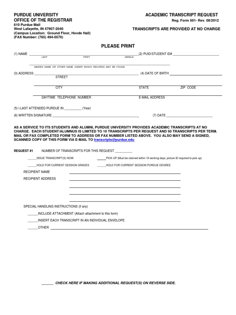 AS A SERVICE TO ITS STUDENTS AND ALUMNI, PURDUE UNIVERSITY PROVIDES ACADEMIC TRANSCRIPTS AT NO CHARGE. EACH STUDENT/ALUMNUS IS LIMITED TO 10 TRANSCRIPTS PER REQUEST AND 50 TRANSCRIPTS PER TERM. MAIL OR FAX COMPLETED FORM TO ADDRESS OR FAX NUMBER LISTED ABOVE. YOU ALSO MAY SEND A SIGNED, SCANNED COPY OF THIS FORM VIA E-MAIL TO transcripts@purdue.edu