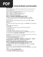 dialog("Login").Dialog("Flight Reservations").CaptureBitmap "d:\login.bmp" bexists=Dialog("Login").Dialog("Flight Reservations").Exist(2) If bexists Then smsg=Dialog("Login").Dialog("Flight Reservations").GetVisibleText reporter.ReportEvent micFail,"Login",smsg Dialog("Login").Dialog("Flight Reservations").WinButton("OK").Click Dialog("Login").WinButton("Cancel").Click exittest End If 4. Reusable Action (Flight Reservation Example) Action1: (Login with incorrect password and cacel) SystemUtil.Run "C:\Program Files\Mercury Interactive\QuickTest Professional\samples\flight\app\flight4a.exe","","C:\Program Files\Mercury Interactive\QuickTest Professional\samples\flight\app\","open" Dialog("Login").WinEdit("Agent Name:").Set "venkatesh" Dialog("Login").WinEdit("Password:").SetSecure "4c0616cda83a5c9f88633cdaff4c044c" Dialog("Login").WinButton("OK").Click bexists=Dialog("Login").Dialog("Flight Reservations").Exist(2) If bexists Then smsg=Dialog("Login").Dialog("Flight Reservations").GetVisibleText reporter.ReportEvent micFail,"Login",smsg Dialog("Login").Dialog("Flight Reservations").WinButton("OK").Click Dialog("Login").WinButton("Cancel").Click End If runaction "Action3",oneiteration Action2: