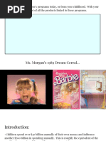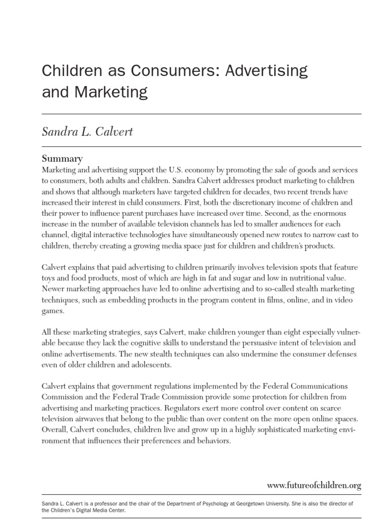 uring the 1920s, U.S. advertising leaders began to see that a consumer society would create larger markets for the surplus fruits of mass production.1 Aware that people might not buy enough goods fast enough on their own, advertisers adopted a strategy of exploiting consumers feelings of inadequacy and sought to market products as a means of alleviating consumers negative self-image. Their strategy succeeded beyond their greatest expectations. Crucial to their success was the emergence and eventual dominance of television in U.S. homes.2 As the medium of television developed, advertisers quickly realized that they could use it to bring products to the attention of mass audiences, both young and old, and thus deliver an enormous supply of children and adults to businesses. Today, marketing and advertising permeate childrens daily lives. Many products marketed to children are not healthful and promote obesity. Younger children often do not understand the persuasive intent of advertisements, and even older children probably have difficulty understanding the intent of newer marketing techniques that blur the line between commercial and program content. Relatively little government regulation protects children from this highly commercialized environment. In this article, I first examine trends that have made children and youth an ever more attractive audience for marketers and advertisers and then look at marketing and advertising practices directed toward youth. I discuss content analyses of foods and beverages, toys, and alcohol and tobacco. I also examine the effects of marketing on children, focusing