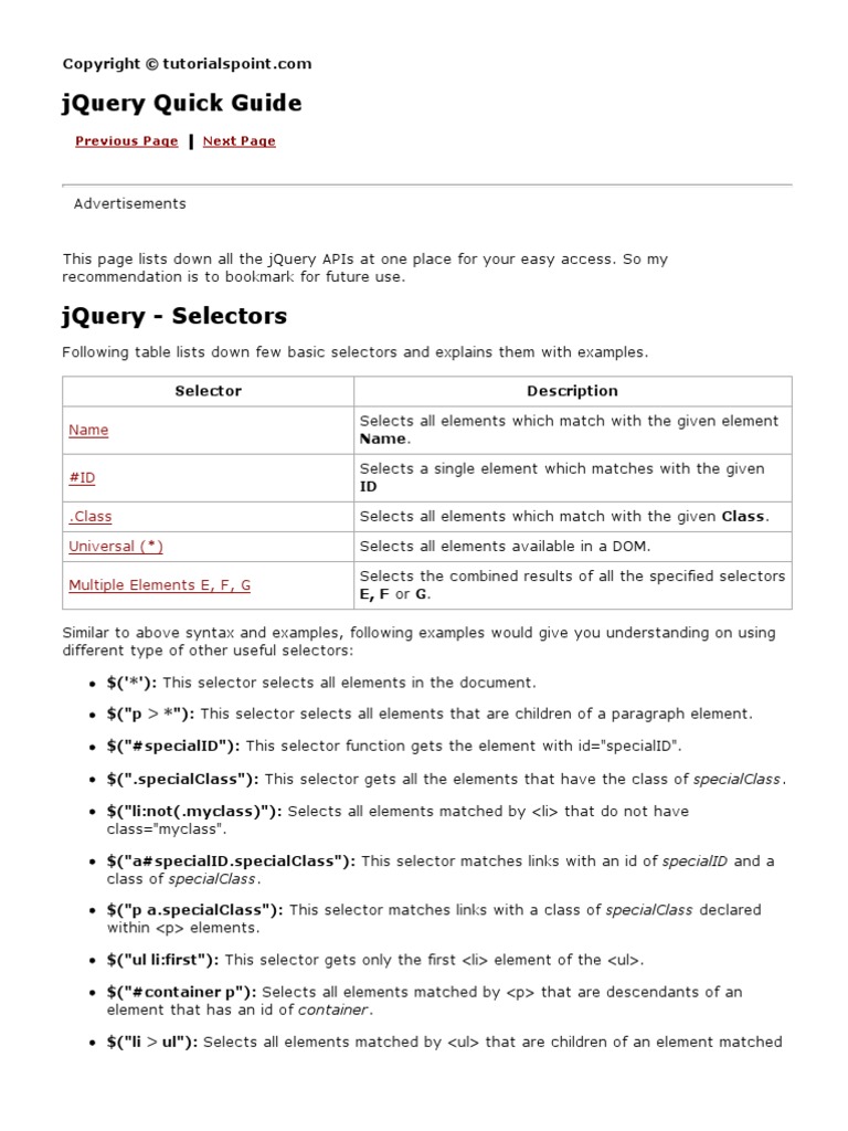 by <li> $("strong + em"): Selects all elements matched by <em> that immediately follow a sibling element matched by <strong>. $("p ~ ul"): Selects all elements matched by <ul> that follow a sibling element matched by <p>. $("code, em, strong"): Selects all elements matched by <code> or <em> or <strong>. $("p strong, .myclass"): Selects all elements matched by <strong> that are descendants of an element matched by <p> as well as all elements that have a class of myclass. $(":empty"): Selects all elements that have no children. $("p:empty"): Selects all elements matched by <p> that have no children. $("div[p]"): Selects all elements matched by <div> that contain an element matched by <p>. $("p[.myclass]"): Selects all elements matched by <p> that contain an element with a class of myclass. $("a[@rel]"): Selects all elements matched by <a> that have a rel attribute. $("input[@name=myname]"): Selects all elements matched by <input> that have a name value exactly equal to myname. $("input[@name^=myname]"): Selects all elements matched by <input> that have a name value beginning with myname. $("a[@rel$=self]"): Selects all elements matched by <p> that have a class value ending with bar $("a[@href*=domain.com]"): Selects all elements matched by <a> that have an href value containing domain.com. $("li:even"): Selects all elements matched by <li> that have an even index value. $("tr:odd"): Selects all elements matched by <tr> that have an odd index value. $("li:first"): Selects the first <li> element. $("li:last"): Selects the last <li> element. $("li:visible"): Selects all elements matched by <li> that are visible. $("li:hidden"): Selects all elements matched by <li> that are hidden. $(":radio"): Selects all radio buttons in the form. $(":checked"): Selects all checked boxex in the form. $(":input"): Selects only form elements (input, select, textarea, button). $(":text"): Selects only text elements (input[type=text]). $("li:eq(2)"): Selects the third <li> element $("li:eq(4)"): Selects the fifth <li> element $("li:lt(2)"): Selects all elements matched by <li> element before the third one; in other