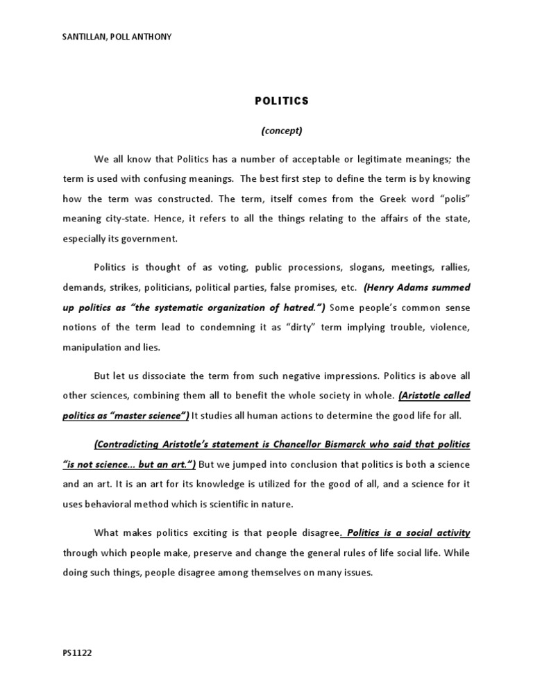 We all know that Politics has a number of acceptable or legitimate meanings; the term is used with confusing meanings. The best first step to define the term is by knowing how the term was constructed. The term, itself comes from the Greek word polis meaning city-state. Hence, it refers to all the things relating to the affairs of the state, especially its government. Politics is thought of as voting, public processions, slogans, meetings, rallies, demands, strikes, politicians, political parties, false promises, etc. (Henry Adams summed up politics as the systematic organization of hatred.) Some peoples common sense notions of the term lead to condemning it as dirty term implying trouble, violence, manipulation and lies. But let us dissociate the term from such negative impressions. Politics is above all other sciences, combining them all to benefit the whole society in whole. (Aristotle called politics as master science) It studies all human actions to determine the good life for all. (Contradicting Aristotles statement is Chancellor Bismarck who said that politics is not science but an art.) But we jumped into conclusion that politics is both a science and an art. It is an art for its knowledge is utilized for the good of all, and a science for it uses behavioral method which is scientific in nature. What makes politics exciting is that people disagree. Politics is a social activity through which people make, preserve and change the general rules of life social life. While doing such things, people disagree among themselves on many issues.