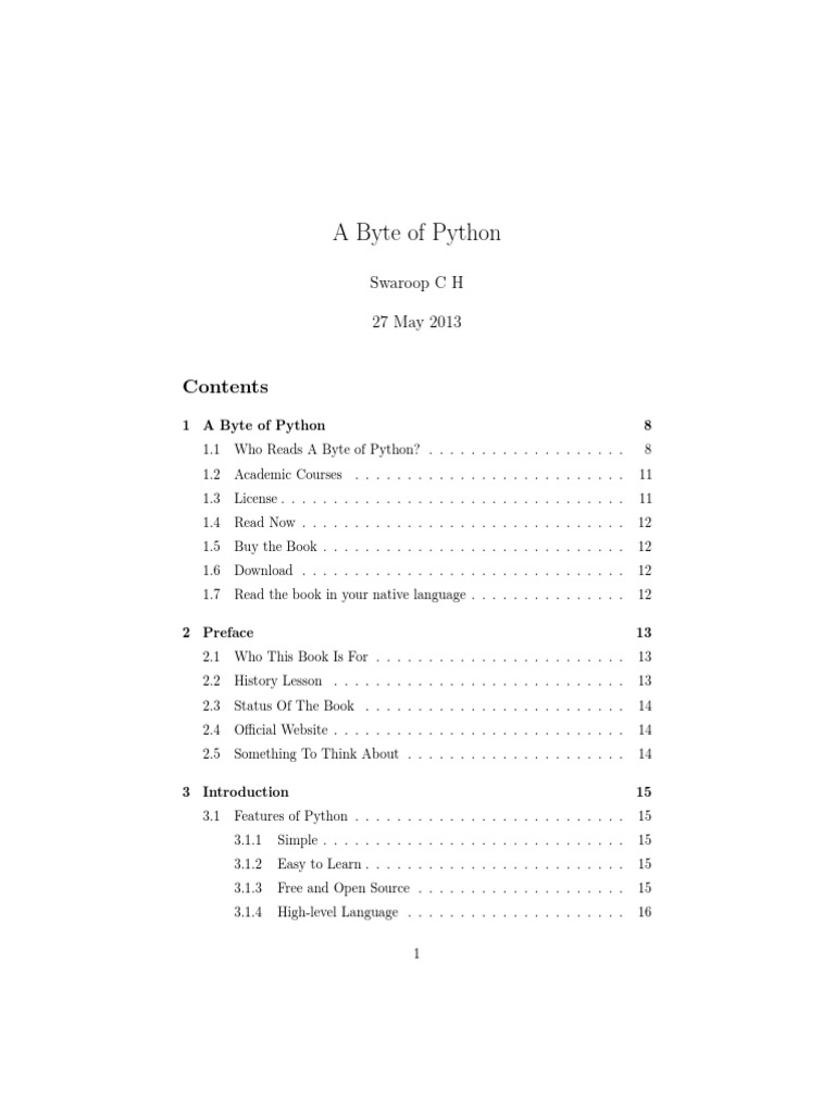 1 A Byte of Python 1.1 1.2 1.3 1.4 1.5 1.6 1.7 Who Reads A Byte of Python? . . . . . . . . . . . . . . . . . . . Academic Courses . . . . . . . . . . . . . . . . . . . . . . . . . . License . . . . . . . . . . . . . . . . . . . . . . . . . . . . . . . . . Read Now . . . . . . . . . . . . . . . . . . . . . . . . . . . . . . . Buy the Book . . . . . . . . . . . . . . . . . . . . . . . . . . . . . Download . . . . . . . . . . . . . . . . . . . . . . . . . . . . . . . Read the book in your native language . . . . . . . . . . . . . . . 8 8 11 11 12 12 12 12 13 13 13 14 14 14 15 15 15 15 15 16