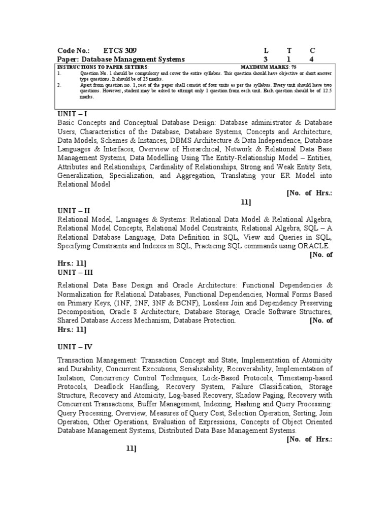 UNIT I Basic Concepts and Conceptual Database Design: Database administrator & Database Users, Characteristics of the Database, Database Systems, Concepts and Architecture, Data Models, Schemes & Instances, DBMS Architecture & Data Independence, Database Languages & Interfaces, Overview of Hierarchical, Network & Relational Data Base Management Systems, Data Modelling Using The Entity-Relationship Model Entities, Attributes and Relationships, Cardinality of Relationships, Strong and Weak Entity Sets, Generalization, Specialization, and Aggregation, Translating your ER Model into Relational Model [No. of Hrs.: 11] UNIT II Relational Model, Languages & Systems: Relational Data Model & Relational Algebra, Relational Model Concepts, Relational Model Constraints, Relational Algebra, SQL A Relational Database Language, Data Definition in SQL, View and Queries in SQL, Specifying Constraints and Indexes in SQL, Practicing SQL commands using ORACLE. [No. of Hrs.: 11] UNIT III Relational Data Base Design and Oracle Architecture: Functional Dependencies & Normalization for Relational Databases, Functional Dependencies, Normal Forms Based on Primary Keys, (1NF, 2NF, 3NF & BCNF), Lossless Join and Dependency Preserving Decomposition, Oracle 8 Architecture, Database Storage, Oracle Software Structures, Shared Database Access Mechanism, Database Protection. [No. of Hrs.: 11] UNIT IV Transaction Management: Transaction Concept and State, Implementation of Atomicity and Durability, Concurrent Executions, Serializability, Recoverability, Implementation of Isolation, Concurrency Control Techniques, Lock-Based Protocols, Timestamp-based Protocols, Deadlock Handling, Recovery System, Failure Classification, Storage Structure, Recovery and Atomicity, Log-based Recovery, Shadow Paging, Recovery with Concurrent Transactions, Buffer Management, Indexing, Hashing and Query Processing: Query Processing, Overview, Measures of Query Cost, Selection Operation, Sorting, Join Operation, Other Operations, Evaluation of Expressions, Concepts of Object Oriented Database Management Systems, Distributed Data Base Management Systems. [No. of Hrs.: 11]