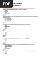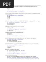 ANSWER : B 24. Do I need IIS to develop a Web application in ASP.NET 2.0? A. Yes B. No ANSWER : B 25. What namespace does the Web page belong in the .NET Framework class hierarchy? A. System.Web.Control B. System.Web.RootBuilder C. System.Web.UserControl D. System.Web.UI.Page ANSWER : D 26. Where would you define application and session level events? A. Global.asax B. Default.aspx C. Web.Config D. General.aspx ANSWER : A 27. What attribute must be set on a validator control for the validation to work? A. Validate B. ValidateControl C. ControlToBind D. ControlToValidate ANSWER : D 28. Which of the following contains web application settings? A. app.config B. web.config C. assembly.config D. machine.config ANSWER : B 29. What is default time of expire session? A. 20 minute B. 40 minute C. 100 minute D. 1200 hours ANSWER : A 30. In Which Page Cycle All Controls Are Fully Loaded? A. Page_Load() B. Page_Init()