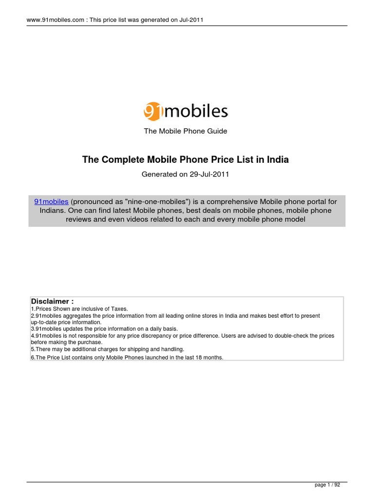 Table Of Content Index ............................................................................. 1 International Mobile Phones ........................................................... 4 Samsung Mobile Price List .............................................................. 5 Nokia Mobile Price List ................................................................ 7 Spice Mobile Price List ................................................................ 8 LG Mobile Price List ................................................................. 10 Sony Ericsson Mobile Price List ......................................................... 12 Motorola Mobile Price List ............................................................. 13 HTC Mobile Price List ............................................................... 14 Blackberry Mobile Price List ............................................................ 15 Intex Mobile Price List ................................................................ 16 Lephone Mobile Price List ............................................................. 17 Gfive Mobile Price List ............................................................... 18 Dell Mobile Price List ................................................................ 19 Apple Mobile Price List ............................................................... 20 Alcatel Mobile Price List .............................................................. 21 Akai Mobile Price List ................................................................ 22 Acer Mobile Price List ............................................................... 23 Huawei Mobile Price List .............................................................. 24 Forme Mobile Price List ............................................................... 25 Orion Mobile Price List ............................................................... 26 GNext Mobile Price List ............................................................... 27 Olive Mobile Price List ............................................................... 28 Rocker Mobile Price List .............................................................. 29 HCL Mobile Price List ................................................................ 30 Binatone Mobile Price List ............................................................. 31 Asus Mobile Price List ................................................................ 32 T- Mobile Price List ................................................................. 33 Joyplus Mobile Price List .............................................................. 34 Swissvoice Mobile Price List ........................................................... 35 ViewSonic Mobile Price List ............................................................ 36 Google Mobile Price List .............................................................. 37 ETouch Mobile Price List .............................................................. 38 Vodafone Mobile Price List ............................................................ 39 Verykool Mobile Price List ............................................................. 40 MSI Mobile Price List ................................................................ 41 Creative Mobile Price List ............................................................. 42 Mi-Fone Mobile Price List ............................................................. 43 Gild Mobile Price List ................................................................ 44 Indian Mobile Phones ............................................................... 45 Micromax Mobile Price List ............................................................ 46 Karbonn Mobile Price List ............................................................. 48 Lava Mobile Price List ................................................................ 50 Videocon Mobile Price List ............................................................. 51 Onida Mobile Price List ............................................................... 53 Maxx Mobile Price List ............................................................... 54 Fly Mobile Price List ................................................................. 55 Lemon Mobile Price List .............................................................. 56 Beetel Mobile Price List ............................................................... 57 Celkon Mobile Price List .............................................................. 58 MVL Mobile Price List ............................................................... 59 IBall Mobile Price List ................................................................ 60