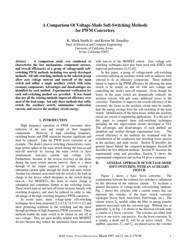 Dept. of Electrical and Computer Engineering University of California, Irvine Irvine, California 92697 Abstract A comparison study was conducted to characterize the loss mechanisms, component stresses, and overall efficiencies of a group of voltage-mode softswitching PWM methods including two newly developed methods. All soft-switching methods in the selected group allow zero voltage turn-on and turn-off of the main switch and utilize a single auxiliary switch with some resonant components. Advantages and disadvantages are identified for each method. Experimental verification for each soft-switching method are provided. It was found that not all the existing methods improved efficiency over most of the load range, but only those methods that softly switch the auxiliary switch, minimumize redirection current, and recover the auxiliary circuit energy. with turn-on of the MOSFET switch. Zero voltage softswitching techniques have also been used with IGBTs with improved performance [4,13,14]. In this paper, a group of voltage-mode soft-switching converters utilizing an auxiliary switch with an inductor were selected to do an efficiency comparison. These methods intend to improve the PWM efficiency by allowing the main switch to be turned on and off with zero voltage and controlling the diode's turn-off transient. Even though the losses in the main switch are dramatically reduced, the auxiliary circuits will add some additional losses to the converter. Therefore, to improve the overall efficiency of the converter, the losses in the auxiliary circuit must be smaller than the energy savings from the soft-switching of the main switch. Identification of the these losses within the auxiliary circuit are crucial to engineering applications. It is the aim of this paper to compare these soft-switching techniques including the two improvement circuits developed at UCI. The advantages and disadvantages of each method are identified and verified through experimental tests. The overall efficiency of the methods are examined with the consideration of the conduction and switching losses present in the auxiliary and main circuit. Section II describes the general theory behind the compared techniques. Section III describes the five different methods. Section IV discusses the experimental setup and procedure. Section V shows the experimental comparison and section VI gives a summary. II. GENERAL APPROACH OF VOLTAGE-MODE SOFT-SWITCHING WITH AN AUXILIARY SWITCH