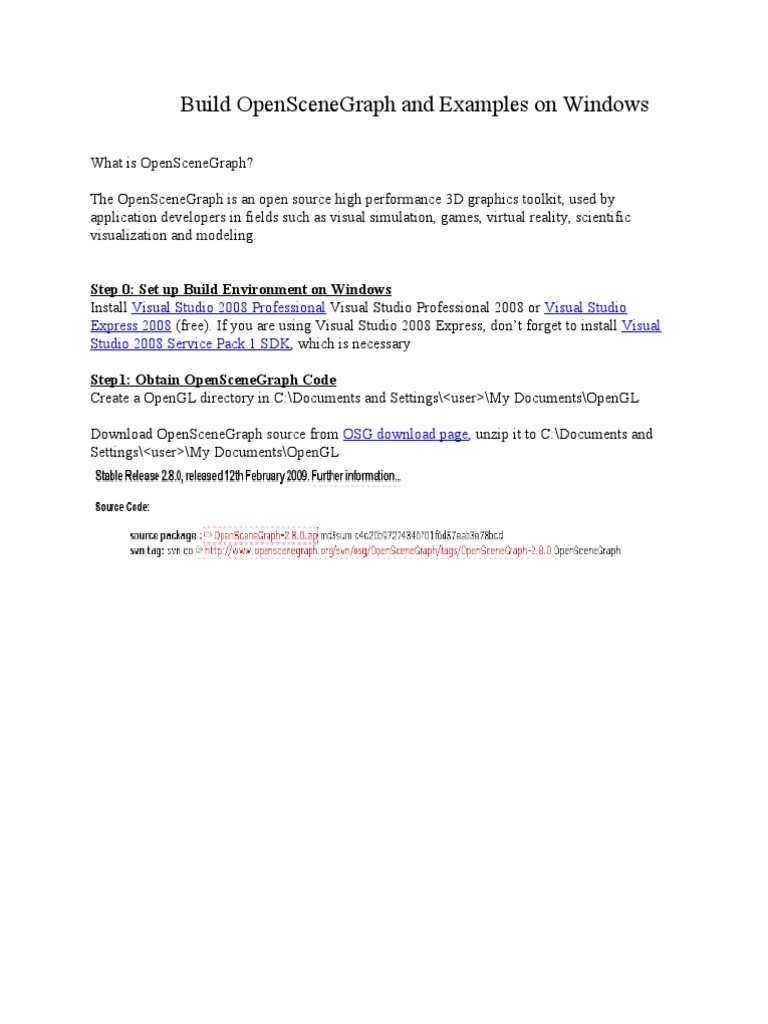 Download OpenSceneGraph source from OSG download page, unzip it to C:\Documents and