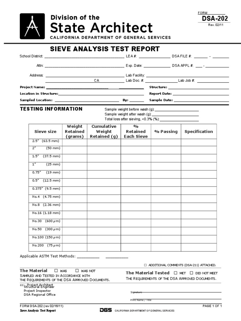 cc: Project Architect Structural Engineer Project Inspector DSA Regional Office FORM DSA-202 (rev 02/16/11) Sieve Analysis Test Report
