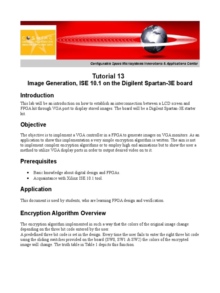 This lab will be an introduction on how to establish an interconnection between a LCD screen and FPGA kit through VGA port to display stored images. The board will be a Digilent Spartan-3E starter kit.