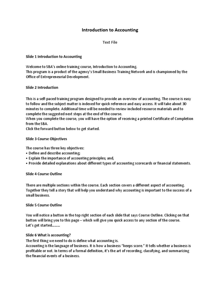 Slide 1 Introduction to Accounting Welcome to SBAs online training course, Introduction to Accounting. This program is a product of the agencys Small Business Training Network and is championed by the Office of Entrepreneurial Development. Slide 2 Introduction This is a self-paced training program designed to provide an overview of accounting. The course is easy to follow and the subject matter is indexed for quick reference and easy access. It will take about 30 minutes to complete. Additional time will be needed to review included resource materials and to complete the suggested next steps at the end of the course. When you complete the course, you will have the option of receiving a printed Certificate of Completion from the SBA. Click the forward button below to get started. Slide 3 Course Objectives The course has three key objectives: Define and describe accounting; Explain the importance of accounting principles; and, Provide detailed explanations about different types of accounting scorecards or financial statements. Slide 4 Course Outline There are multiple sections within the course. Each section covers a different aspect of accounting. Together they tell a story that will help you understand why accounting is important to the success of a small business. Slide 5 Course Outline You will notice a button in the top right section of each slide that says Course Outline. Clicking on that button will bring you to this page which will give you quick access to any section of the course. Lets get started Slide 6 What is accounting? The first thing we need to do is define what accounting is. Accounting is the language of business. It is how a business keeps score. It tells whether a business is profitable or not. In terms of a formal definition, its the art of recording, classifying, and summarizing the financial events of a business.