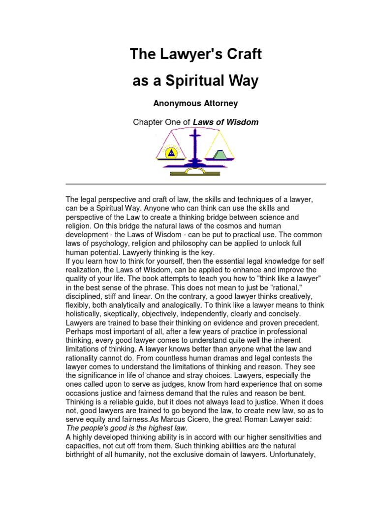 The legal perspective and craft of law, the skills and techniques of a lawyer, can be a Spiritual Way. Anyone who can think can use the skills and perspective of the Law to create a thinking bridge between science and religion. On this bridge the natural laws of the cosmos and human development - the Laws of Wisdom - can be put to practical use. The common laws of psychology, religion and philosophy can be applied to unlock full human potential. Lawyerly thinking is the key. If you learn how to think for yourself, then the essential legal knowledge for self realization, the Laws of Wisdom, can be applied to enhance and improve the quality of your life. The book attempts to teach you how to "think like a lawyer" in the best sense of the phrase. This does not mean to just be "rational," disciplined, stiff and linear. On the contrary, a good lawyer thinks creatively, flexibly, both analytically and analogically. To think like a lawyer means to think holistically, skeptically, objectively, independently, clearly and concisely. Lawyers are trained to base their thinking on evidence and proven precedent. Perhaps most important of all, after a few years of practice in professional thinking, every good lawyer comes to understand quite well the inherent limitations of thinking. A lawyer knows better than anyone what the law and rationality cannot do. From countless human dramas and legal contests the lawyer comes to understand the limitations of thinking and reason. They see the significance in life of chance and stray choices. Lawyers, especially the ones called upon to serve as judges, know from hard experience that on some occasions justice and fairness demand that the rules and reason be bent. Thinking is a reliable guide, but it does not always lead to justice. When it does not, good lawyers are trained to go beyond the law, to create new law, so as to serve equity and fairness.As Marcus Cicero, the great Roman Lawyer said: The people's good is the highest law. A highly developed thinking ability is in accord with our higher sensitivities and capacities, not cut off from them. Such thinking abilities are the natural birthright of all humanity, not the exclusive domain of lawyers. Unfortunately,