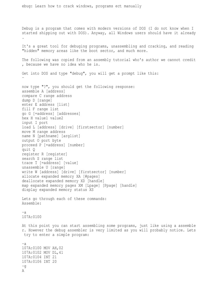 Debug is a program that comes with modern versions of DOS (I do not know when I started shipping out with DOS). Anyway, all Windows users should have it already . It's a great tool for debuging programs, unassembling and cracking, and reading "hidden" memory areas like the boot sector, and much more. The following was copied from an assembly tutorial who's author we cannot credit , because we have no idea who he is. Get into DOS and type "debug", you will get a prompt like this: now type "?", you should get the following response: assemble A [address] compare C range address dump D [range] enter E address [list] fill F range list go G [=address] [addresses] hex H value1 value2 input I port load L [address] [drive] [firstsector] [number] move M range address name N [pathname] [arglist] output O port byte proceed P [=address] [number] quit Q register R [register] search S range list trace T [=address] [value] unassemble U [range] write W [address] [drive] [firstsector] [number] allocate expanded memory XA [#pages] deallocate expanded memory XD [handle] map expanded memory pages XM [Lpage] [Ppage] [handle] display expanded memory status XS Lets go through each of these commands: Assemble: -a 107A:0100 At this point you can start assembling some programs, just like using a assemble r. However the debug assembler is very limited as you will probably notice. Lets try to enter a simple program: -a 107A:0100 107A:0102 107A:0104 107A:0106 -g A MOV MOV INT INT AH,02 DL,41 21 20