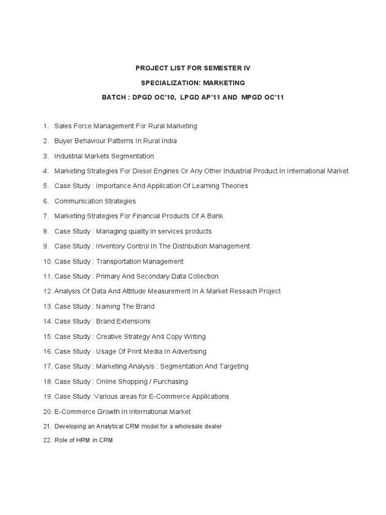 1. Sales Force Management For Rural Marketing 2. Buyer Behaviour Patterns In Rural India 3. Industrial Markets Segmentation 4. Marketing Strategies For Diesel Engines Or Any Other Industrial Product In International Market 5. Case Study : Importance And Application Of Learning Theories 6. Communication Strategies 7. Marketing Strategies For Financial Products Of A Bank 8. Case Study : Managing quality in services products 9. Case Study : Inventory Control In The Distribution Management 10. Case Study : Transportation Management 11. Case Study : Primary And Secondary Data Collection 12. Analysis Of Data And Attitude Measurement In A Market Reseach Project 13. Case Study : Naming The Brand 14. Case Study : Brand Extensions 15. Case Study : Creative Strategy And Copy Writing 16. Case Study : Usage Of Print Media In Advertising 17. Case Study : Marketing Analysis : Segmentation And Targeting 18. Case Study : Online Shopping / Purchasing 19. Case Study :Various areas for E-Commerce Applications 20. E-Commerce Growth In International Market