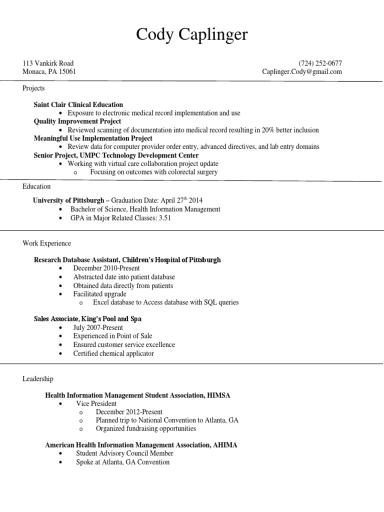 113 Vankirk Road Monaca, PA 15061 Projects Saint Clair Clinical Education Exposure to electronic medical record implementation and use Quality Improvement Project Reviewed scanning of documentation into medical record resulting in 20% better inclusion Meaningful Use Implementation Project Review data for computer provider order entry, advanced directives, and lab entry domains Senior Project, UMPC Technology Development Center Working with virtual care collaboration project update o Focusing on outcomes with colorectal surgery Education University of Pittsburgh Graduation Date: April 27th 2014 Bachelor of Science, Health Information Management GPA in Major Related Classes: 3.51 (724) 252-0677 Caplinger.Cody@gmail.com
