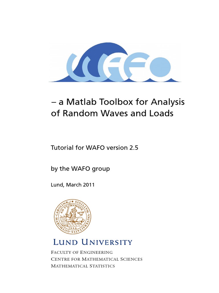 This is a tutorial for how to use the M ATLAB toolbox WAFO for analysis and simulation of random waves and random fatigue. The toolbox consists of a number of M ATLAB mles together with executable routines from F ORTRAN or C++ source, and it requires only a standard M ATLAB setup, with no additional toolboxes. A main and unique feature of WAFO is the module of routines for computation of the exact statistical distributions of wave and cycle characteristics in a Gaussian wave or load process. The routines are described in a series of examples on wave data from sea surface measurements and other load sequences. There are also sections for fatigue analysis and for general extreme value analysis. Although the main applications at hand are from marine and reliability engineering, the routines are useful for many other applications of Gaussian and related stochastic processes. The routines are based on algorithms for extreme value and crossing analysis, developed over many years by the authors as well as many results available in the literature. References are given to the source of the algorithms whenever it is possible. These references are given in the M ATLAB-code for all the routines and they are also listed in the last section of this tutorial. If the references are not used explicitly in the tutorial; it means that it is referred to in one of the M ATLAB m-les. Besides the dedicated wave and fatigue analysis routines the toolbox contains many statistical simulation and estimation routines for general use, and it can therefore be used as a toolbox for statistical work. These routines are listed, but not explicitly explained in this tutorial. The present toolbox represents a considerable development of two earlier toolboxes, the FAT and WAT toolboxes, for fatigue and wave analysis, respectively. These toolboxes were both Version 1; therefore WAFO has been named Version 2. The routines in the tutorial are tested on WAFO-version 2.5, which was made available in beta-version in January 2009 and in a stable version in February 2011. The persons that take actively part in creating this tutorial are (in alphabetical order): Per Andreas Brodtkorb1 , P ar Johannesson2 , Georg Lindgren3 , Igor Rychlik4.