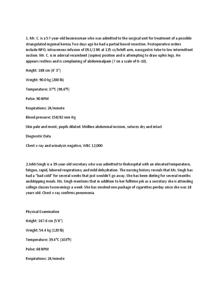 1. Mr. C. is a 57-year-old businessman who was admitted to the surgical unit for treatment of a possible strangulated inguinal hernia.